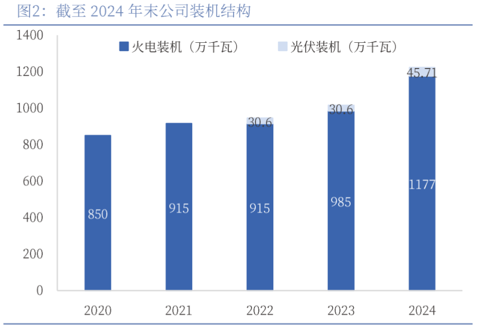 截至24年末,公司的火电装机1177万千瓦,占公司总装机96.26%,光伏装机45.71万千瓦,占公司总装机3.74%。