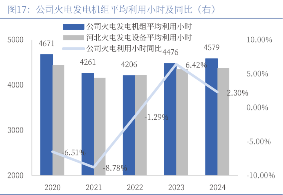 公司2019-2022年上网电量和利用小时持续下滑,受益于河北省用电需求的增加,公司火电平均利用小时在2023年、2024年达到4476小时、4579小时,同比分别增长6.42%、2.30%。且公司2020-2024五年平均火电利用小时数高出河北同期平均火电利用小时数126小时。
