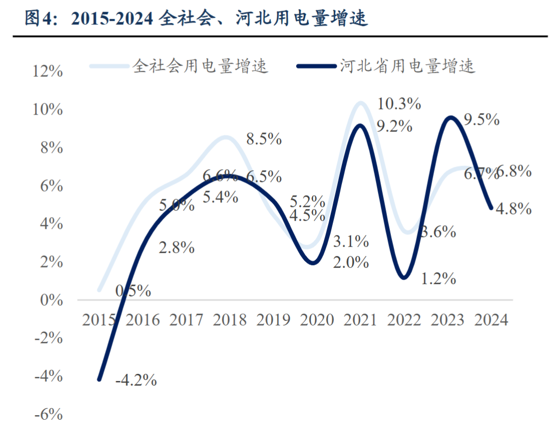 2024 年河北省常规电源火、水、核电占比 63%、2%、0%,显著低于全国占比 67%、14%、5%。水电跟核电占比都非常少。