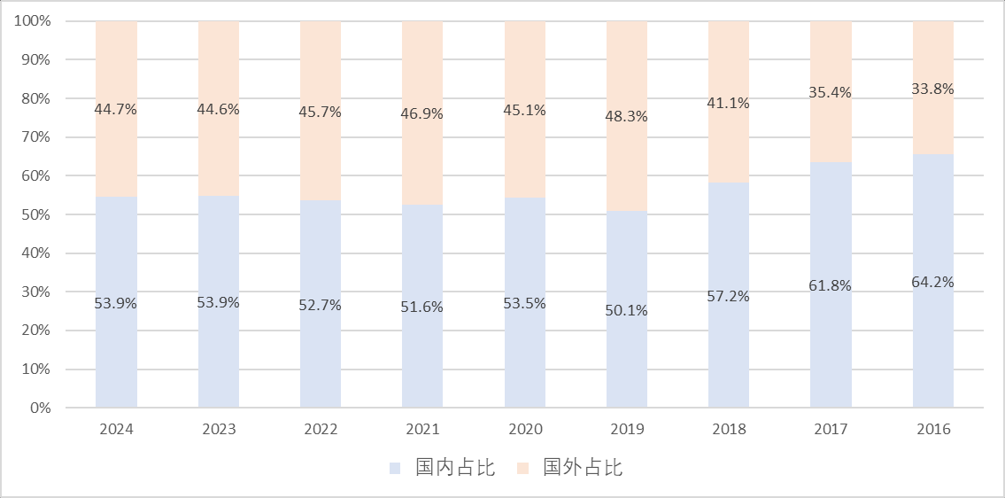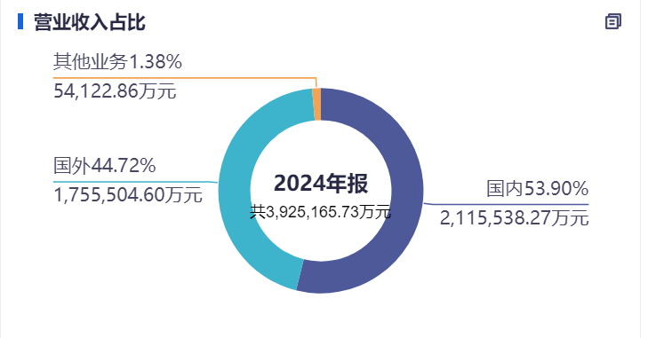海外业务占比越来越高,截止25H1海外业务占比已经达到了44.7%。