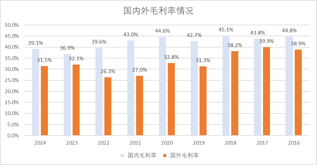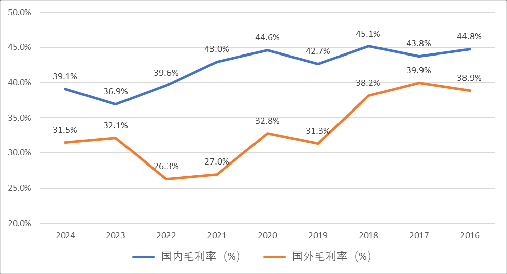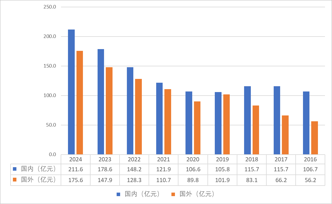 公司海外业务保持较好的成长性,从2016年的56亿元增长到24年的175.6亿元,