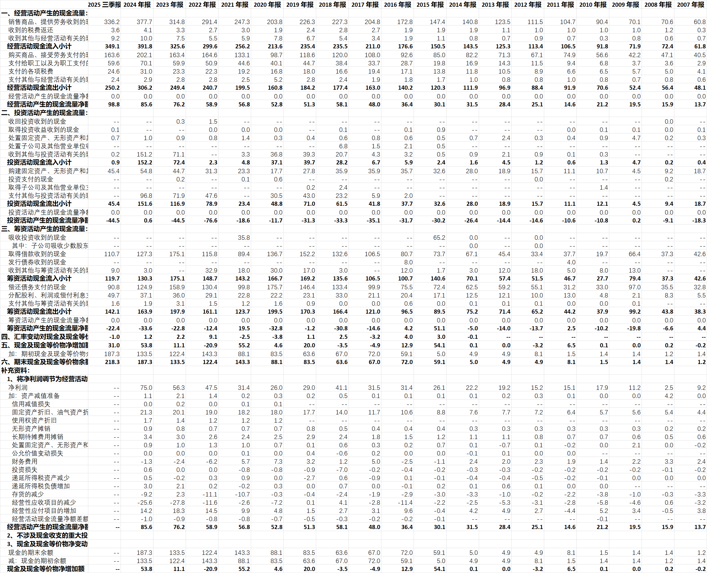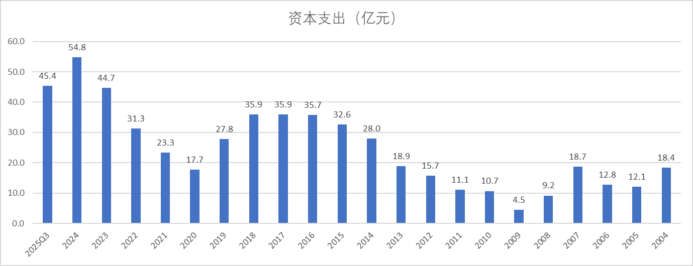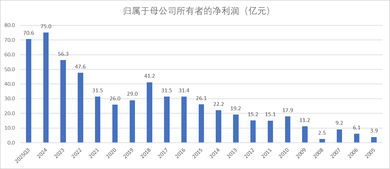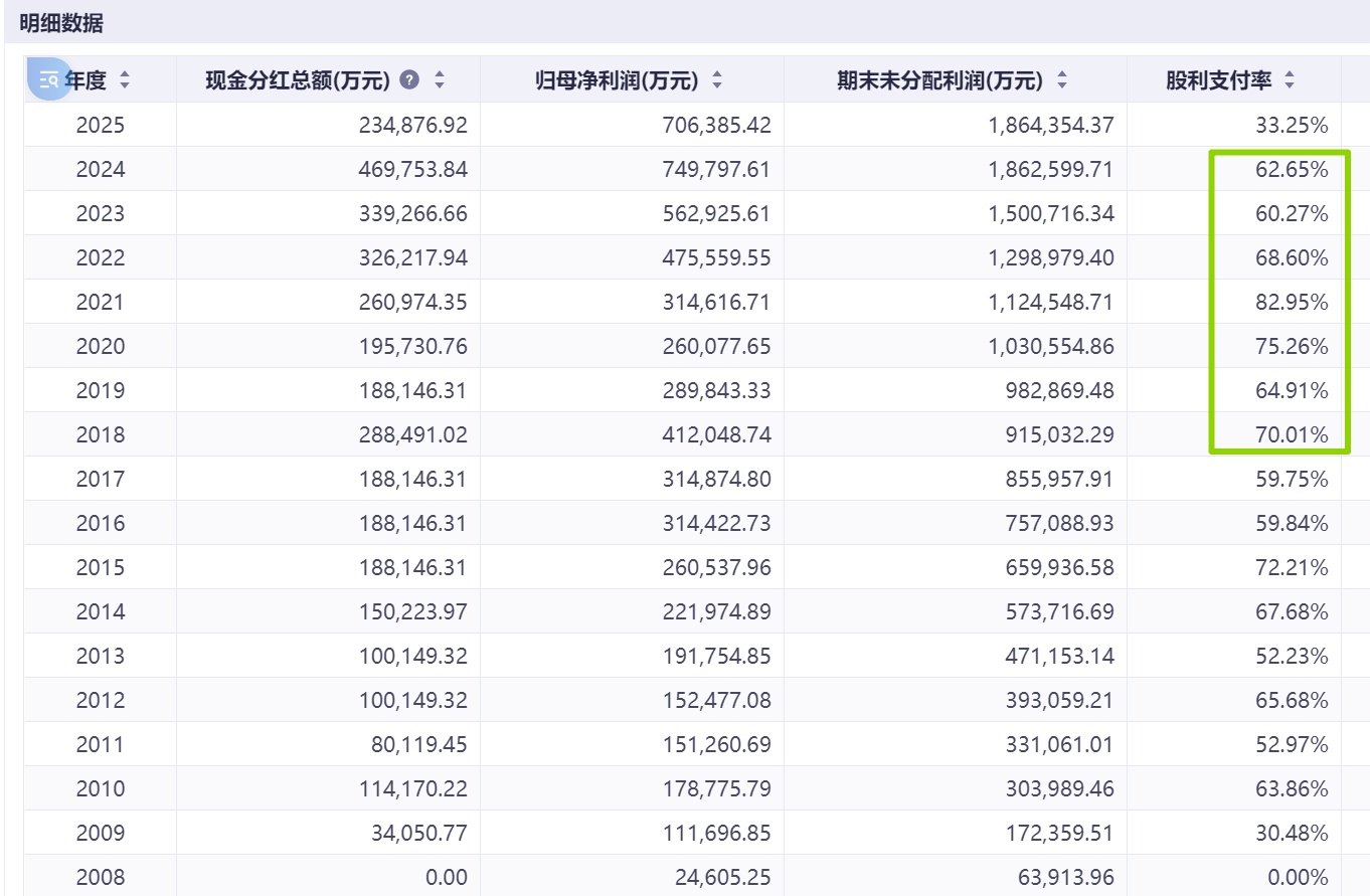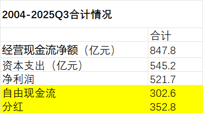 公司自2004-2025Q3累计实现的净利润是521亿元,自由现金流303亿元,分红353亿元。这里又一次印证了公司尽可能的给股东分红,分红金额甚至还略高于自由现金流(永新股份也是一个这样的例子,参见:网页链接{永新股份笔记 })