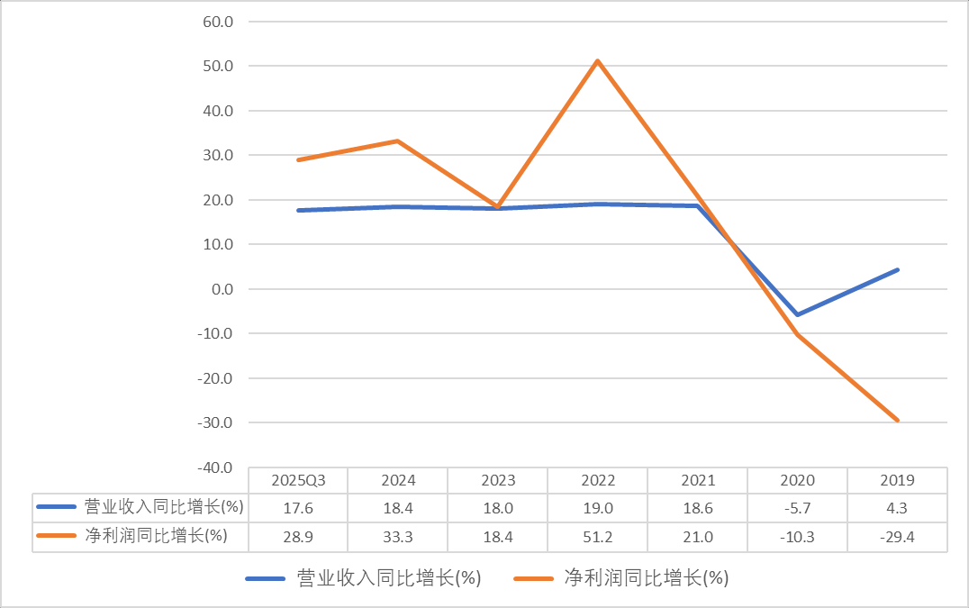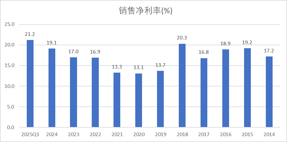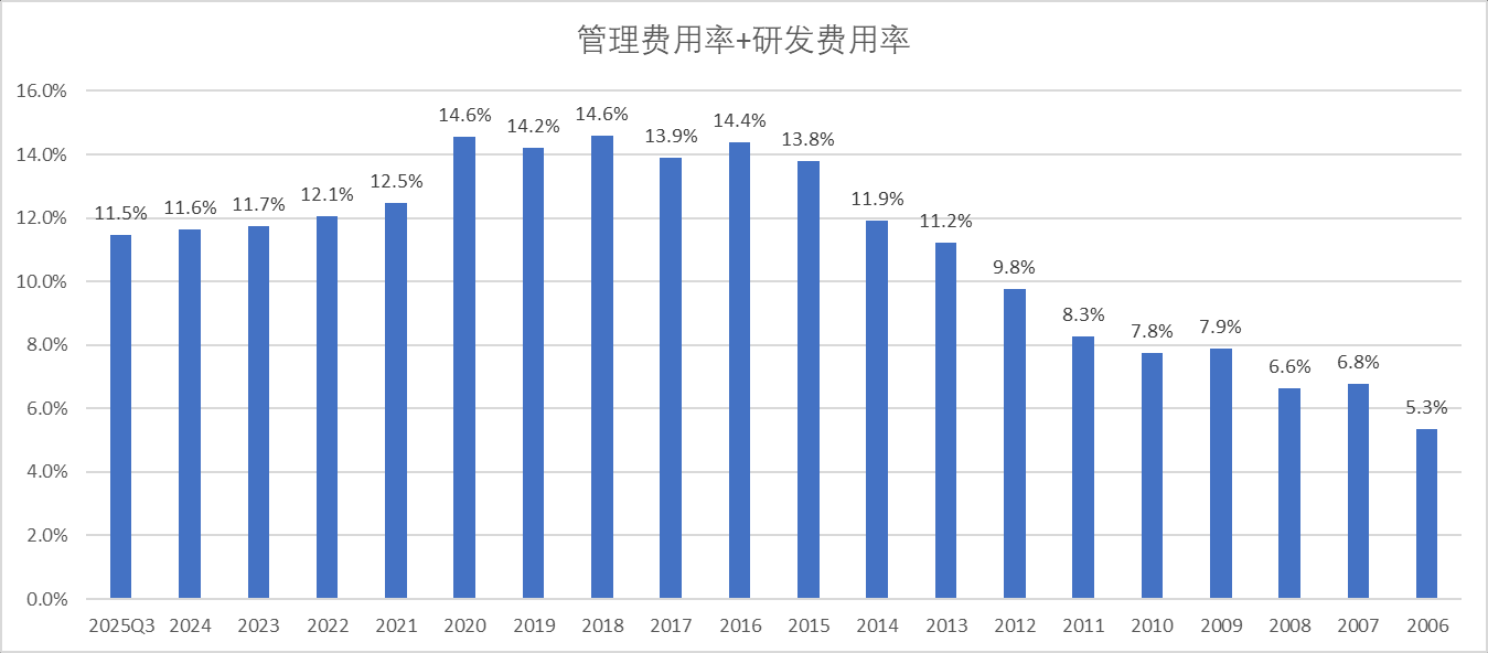 公司净利率自2020年的13.1%提高到25Q3的21.2%,一方面是因为毛利率的提高;另外一方面是因为公司费用率下降(见下文)