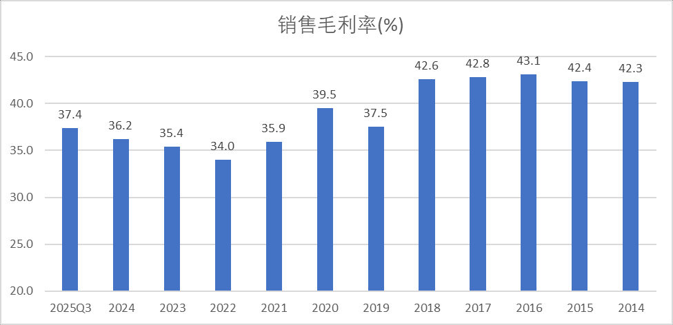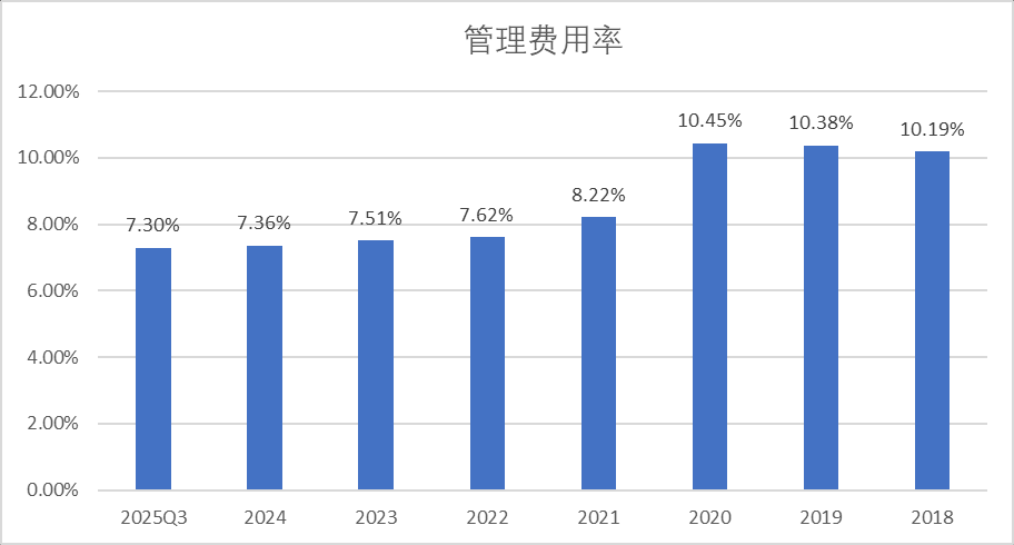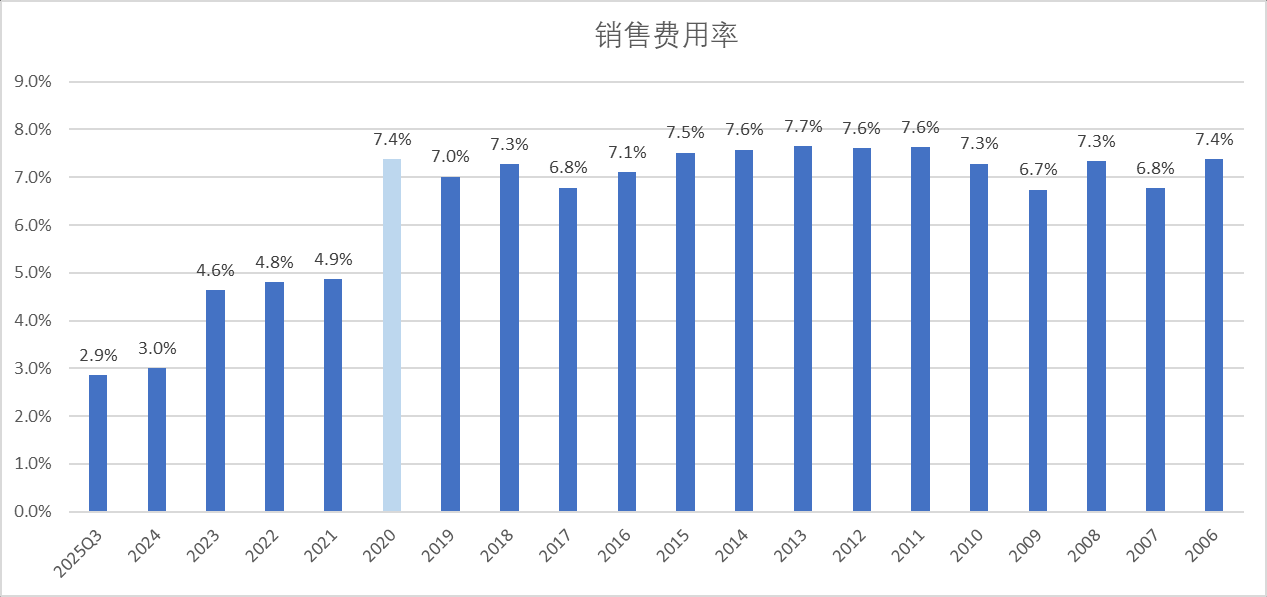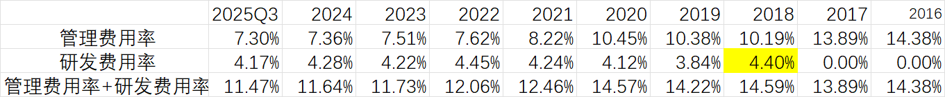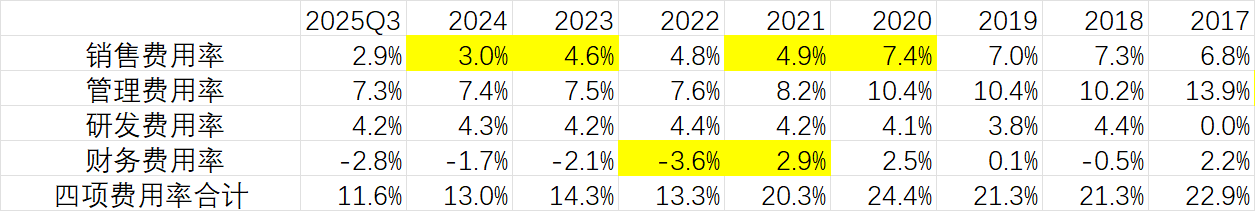 公司四项费用率自20年的高点24.4%下降到25Q3的11.6%。