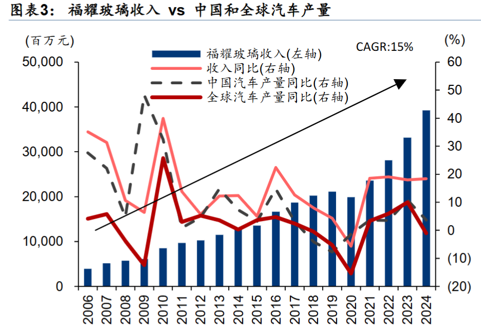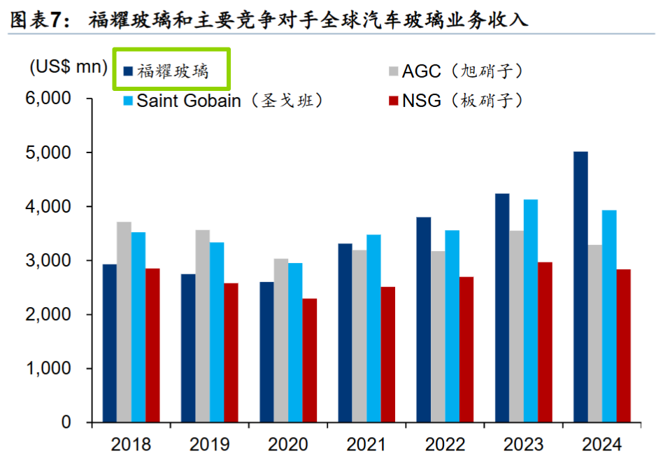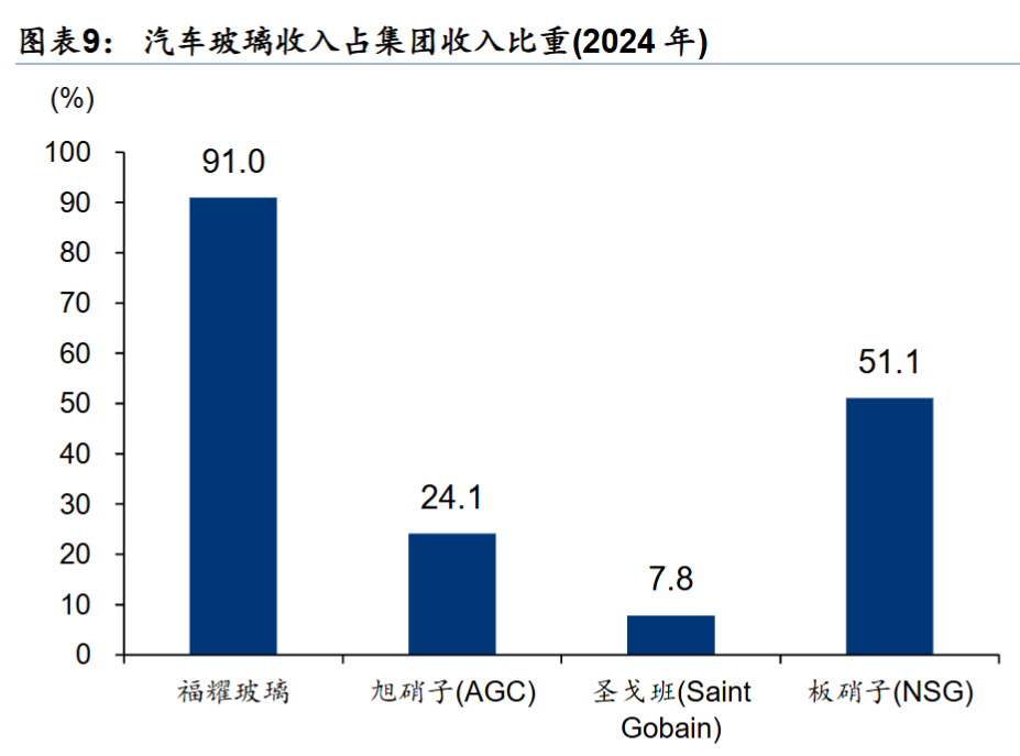 相对于竞争对手,福耀玻璃更加的专注。2024 年汽车玻璃占福耀总收入的 91%。相比之下,主要竞争对手的多元化程度更高,2024 年旭硝子、圣戈班、板硝子汽车玻璃业的收入占比分别为24.1%、7.8%、51.1%。福耀 2003 年延伸汽车级浮法玻璃生产,2008 年退出建筑浮法玻璃,全面聚焦研发生产汽车玻璃