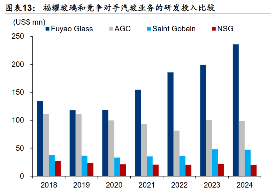 下图是福耀与竞争对手在研发金额上的对比,福耀在研发上投入更高,不断的构建自己的竞争壁垒。(如果考虑到中国工程师的薪资水平要低于海外发达,研发强度要更高)