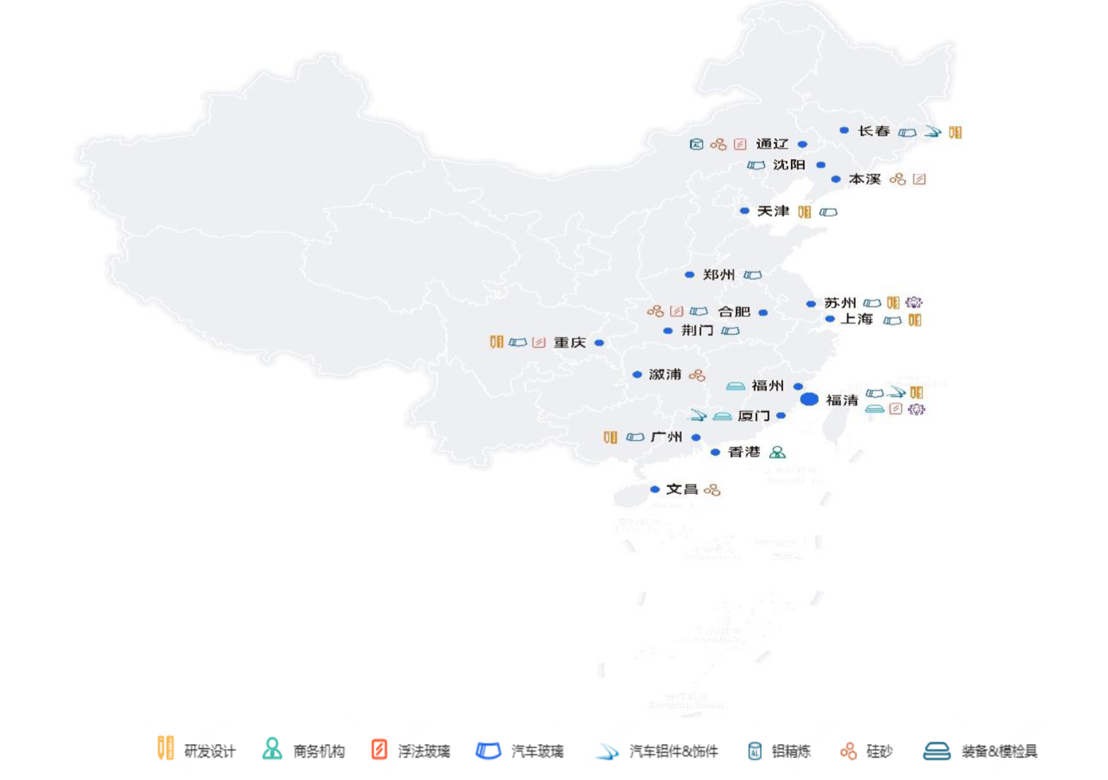 福耀玻璃汽车玻璃布局在全国各个汽车主要产地。例如上海,苏州,长春,沈阳,重庆等等。