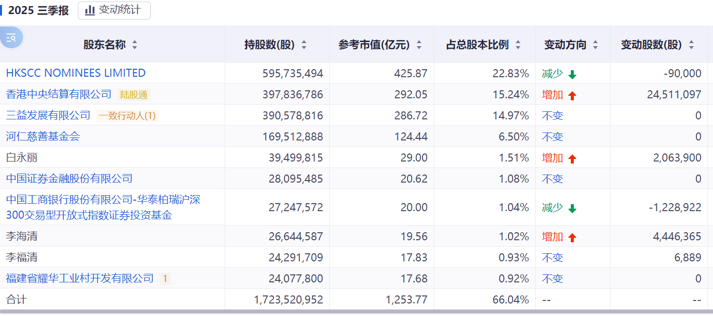 公司第一大股东HKSCC NOMINEES LIMITED是公司香港上市的股份;第二大股东为香港中央结算有限公司,持股比例 15.24%,是港股通的持股;第三大股东“三益发展”,持股比例 14.97%,是公司的实际控制人曹德旺家族。25年10月曹德旺退休,儿子曹晖接班。