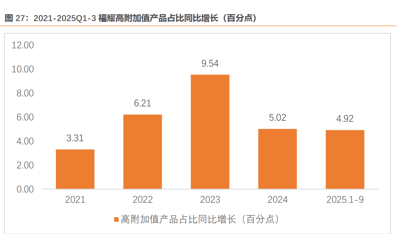 据公司年报及投资者关系活动记录表(20250829),公司 1H25 公司全景天幕、HUD 抬头显示玻璃、多层隔音玻璃和适用 ADAS 摄像头的前挡玻璃等高附加值产品收入占比 51%,同比+5pct。