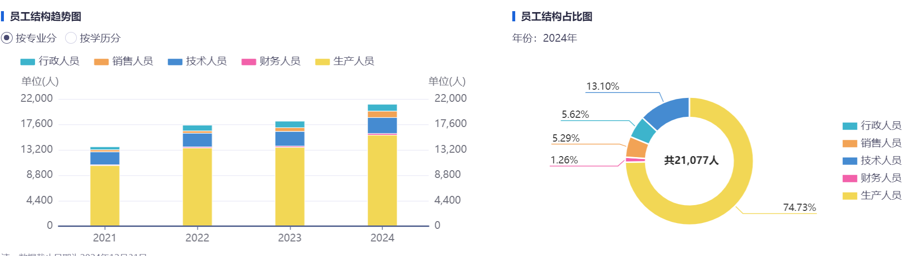 公司员工占比74.7%的都为生产员工,典型的制造业。其次是占比13.1%的技术人员