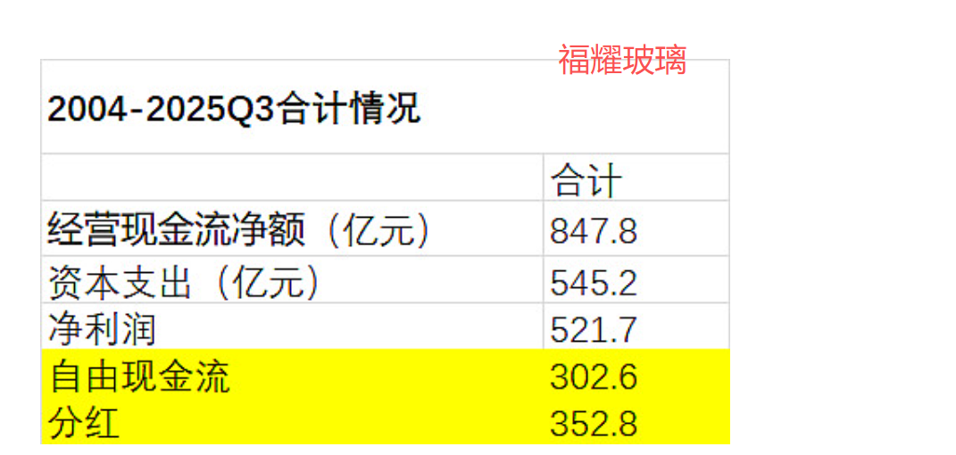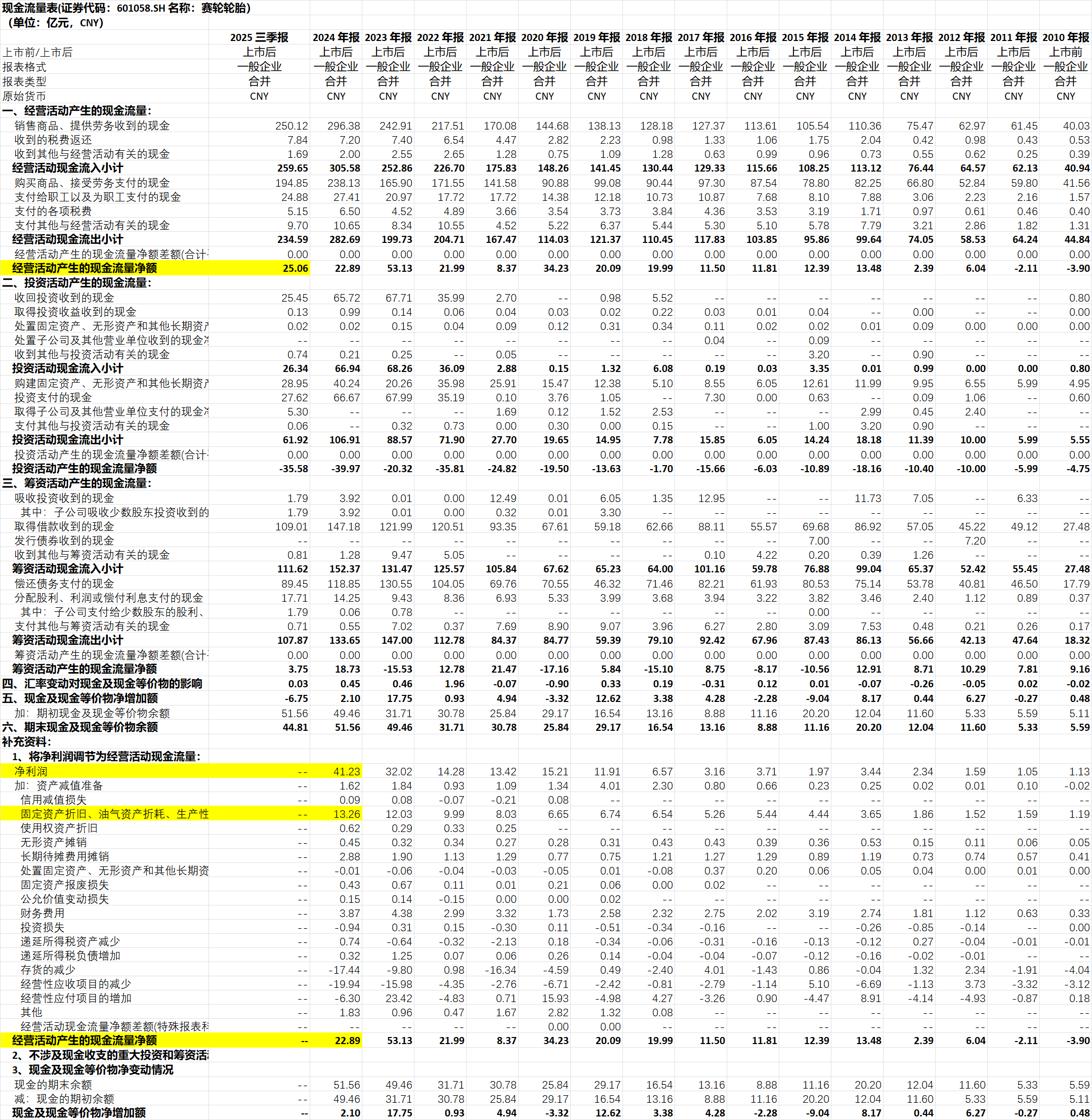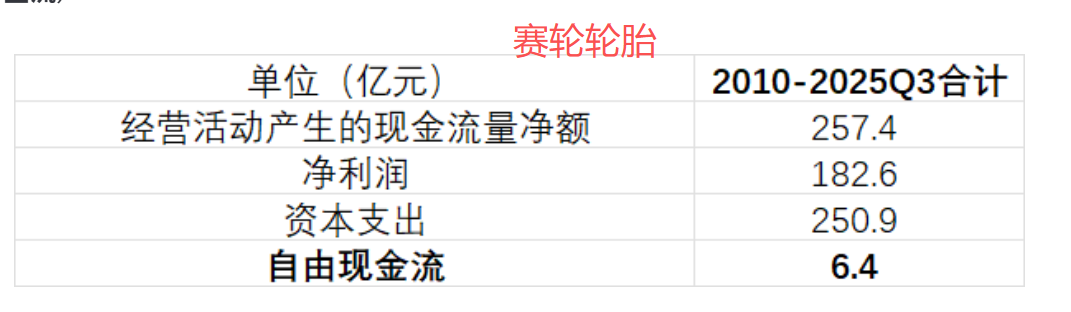 统计2010-2025Q3累计的现金流情况,这期间,累计实现经营现金流净额257.4亿元,累计资本支出250.9亿元,累计的自由现金流仅仅6.4亿元。