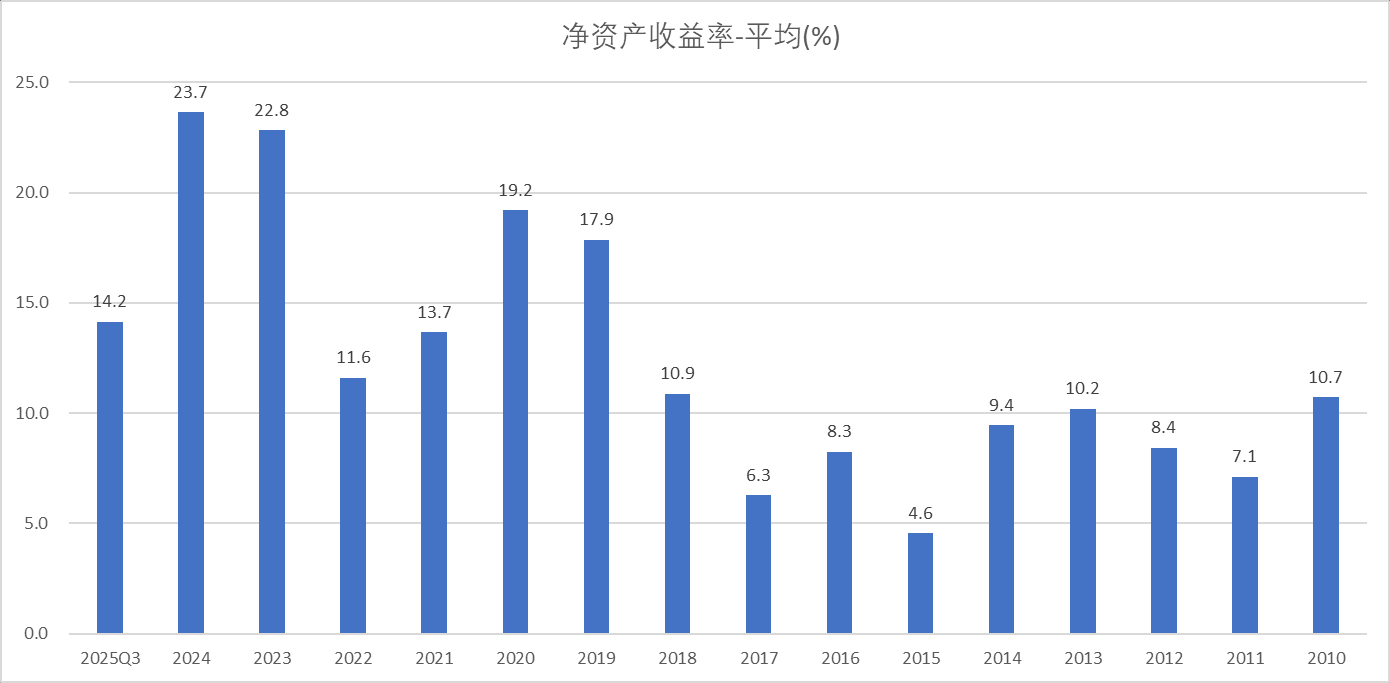 公司的净资产收益率波动较大,高的时候(24年)达到23.7%