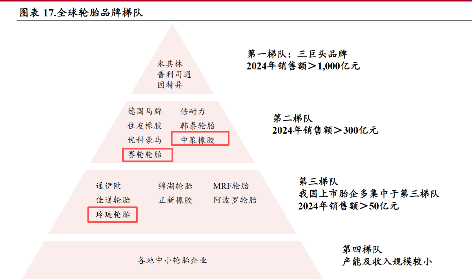 2)第二梯队:主要包括德国马牌、倍耐力、住友橡胶等海外品牌及少数国内品牌,在品牌力和产品溢价上稍逊于三家头部企业,但依然具有较为深厚的技术沉淀,能够配套部分高端车型,2024 年销售额在 300 亿元以上。