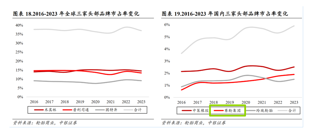 根据轮胎商业数据,2016-2023 年米其林、普利司通、固特异合计市占率由 37.68%下降至 36.99%,同期国内三家轮胎头部企业中策橡胶、赛轮轮胎、玲珑轮胎市占率由 3.63%提升至 5.90%。赛轮轮胎的市占率进步较快,赛轮23年全球的市占率在2%左右。
