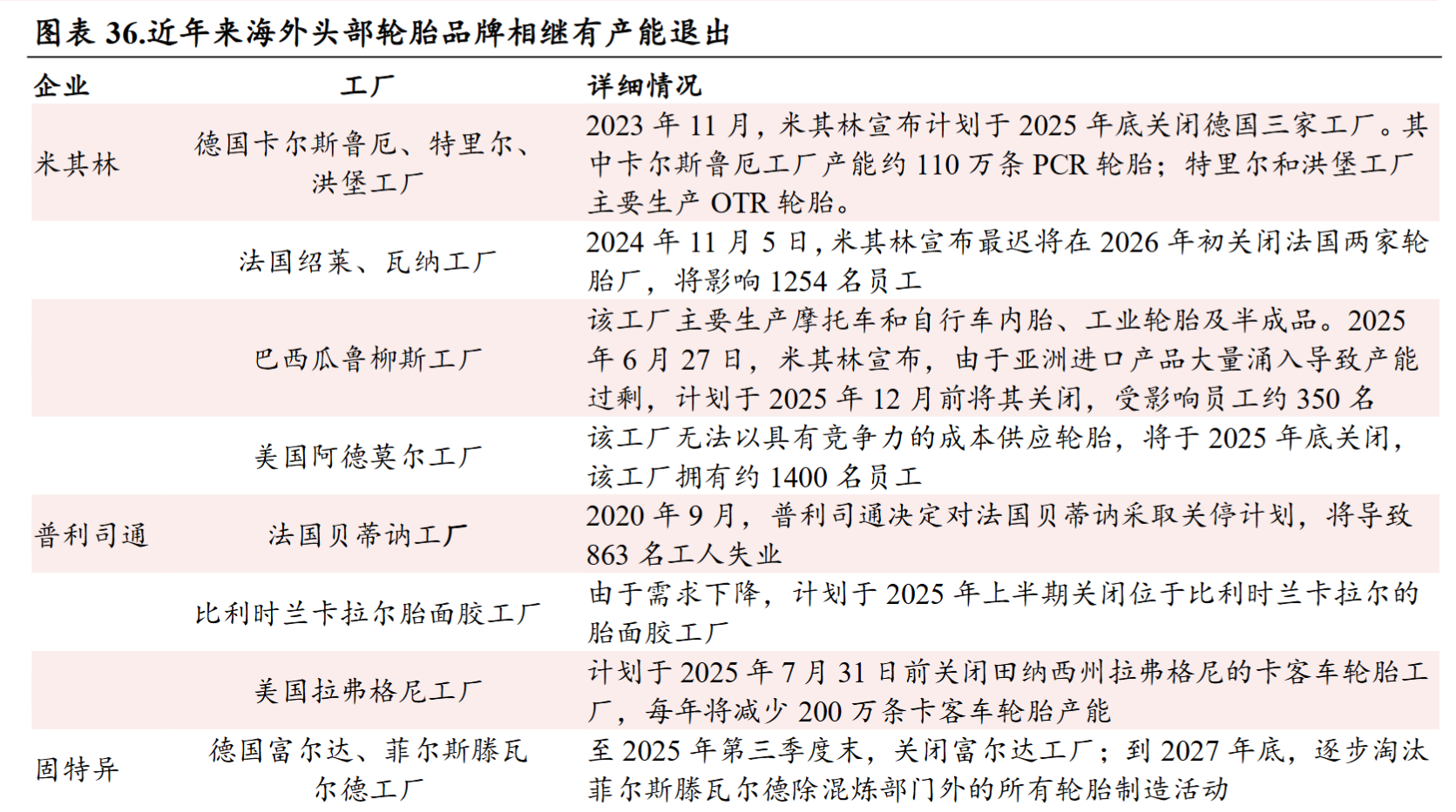 一方面,欧洲本土的老旧产能带来的成本压力持续侵蚀轮胎厂利润,并加速落后产能退出;另一方面,亚洲高性价比轮胎份额的增长,使得部分欧洲产能相对过剩。根据青岛双星公告,2022 年以来米其林、固特异、普利司通等海外头部轮胎企业在欧美地区(含俄罗斯)关停或减产的轮胎工厂超过 15 个,其中欧洲地区(不含俄罗斯)超过10 个,基本为 50 年以上老厂,共涉及轮胎年产能超过 5000 万条。