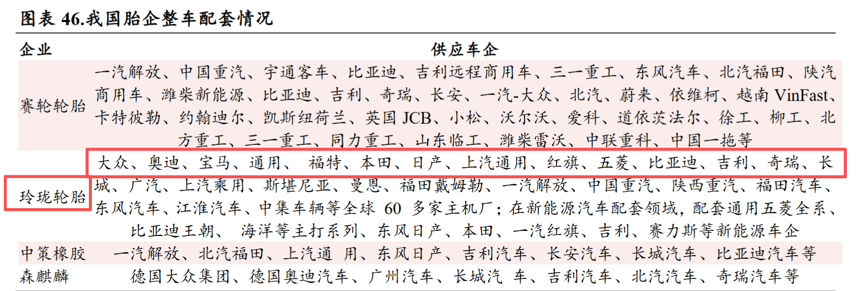 配套:国内头部轮胎企业凭借产品品质和技术含量,打入国内外车企供应商名单。目前高端车型的配套市场(尤其是豪华品牌和超高性能领域)仍然由米其林、普利司通、德国马牌、固特异等国际巨头主导,它们凭借百年技术积淀和品牌溢价牢牢掌控着大部分市场份额和利润。 不过,以玲珑、赛轮为代表的中国头部品牌正在加速突破,在新能源赛道和部分豪华车型上已取得显著进展,正在逐步改写市场格局。玲珑轮胎在国内配套市场是做的较为领先的