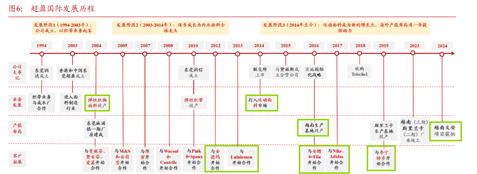 第三阶段(2014 年至今):运动面料成为增长新引擎,海外产能布局推动发展。2014 年后,随着内衣市场空间被充分挖掘,公司转向运动市场打造第二成长曲线。得益于运动 产品面料结构与内衣相似,且用料需求量较内衣更大,运动板块的快速成长为公司提供了 最主要的收入来源。2017 年起,公司布局劳动力成本更低的越南、斯里兰卡生产基地。2024 年 11 月公司对越南义安合计 5.9 亿美元的直接投资项目获批