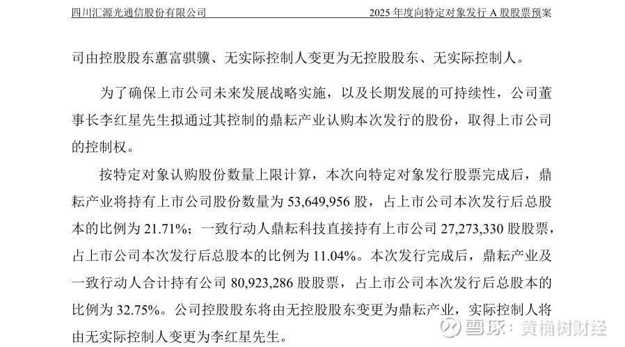 2025年11月18日晚间,汇源通信(000586.SZ)发布《2025年度向特定对象发行A股股票预案》、《关于筹划公司控制权变更事项进展暨复牌的提示性公告》等多则公告。