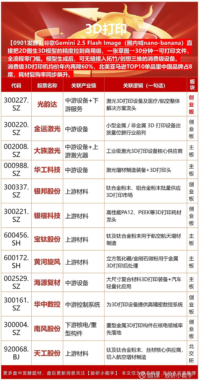 当AI把设计门槛降到零,当大厂把订单和产能同时打满,3D打印不再是主题投资,而是业绩与渗透率双击的主升浪,仓位上别掉队!
