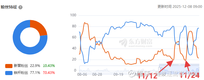 【粉丝特征曲线】希望今明两天万通的该曲线喇叭口越来越大,11月12日和24日橙色线(新晋粉丝)分别为20.12%和18.94%,然后发生了什么?自己去看K线,目前是30.42%!(今早橙色线下降到了23.33%)