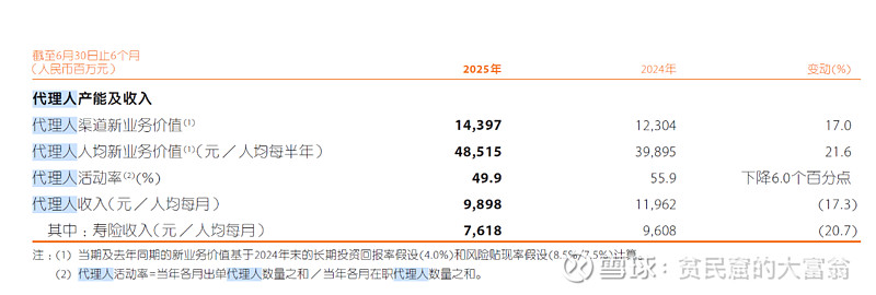 其中代理人数量24年12月底为36.3万人,25年一季度为33.8万人,25年6月底为34万人,季度环比轻微上升,但是在人均新业务价值大幅度提高的背景下,代理人收入同比下降17.3%,大概率是报行合一的影响。