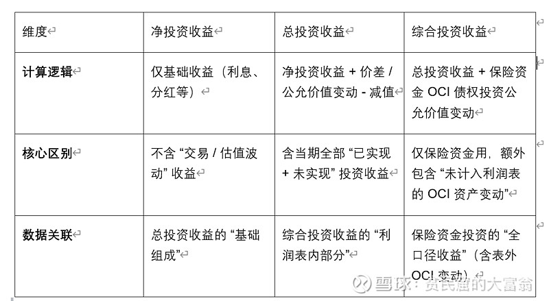 净投资收益 →(+短期波动)→ 总投资收益 →(+长期账面变动)→ 综合投资收益