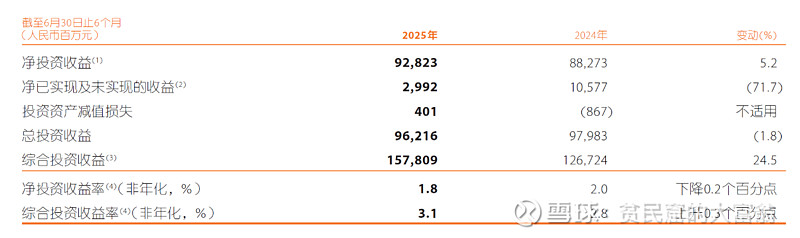1.净投资收益:以持有资产获取的 "基础收益" 为主,含存款利息、债券利息、股票分红、投资性物业租金等,是投资收益的 "核心稳定部分"( 2025 年上半年为 928.23 亿元)。