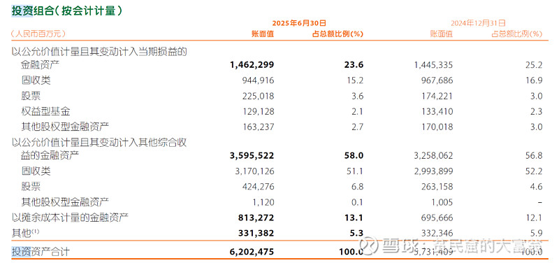 说明:公司将举牌银行股等长期战略权益投资分类为 "其他权益工具投资",根据会计准则,该类投资的公允价值变动永久计入其他综合收益,不允许重分类进损益(即使未来处置资产,累计变动也需直接转入未分配利润,而非利润表投资收益),以此规避短期股价波动对利润的干扰,适配保险资金 "长期持有、战略投资" 的需求。截至 2025 年 6 月 30 日,计入 OCI 账户的股票投资账面价值为4242.76 亿元,较年初净增加1611.18 亿元(主要因上半年举牌银行股新增投资及公允价值上涨)