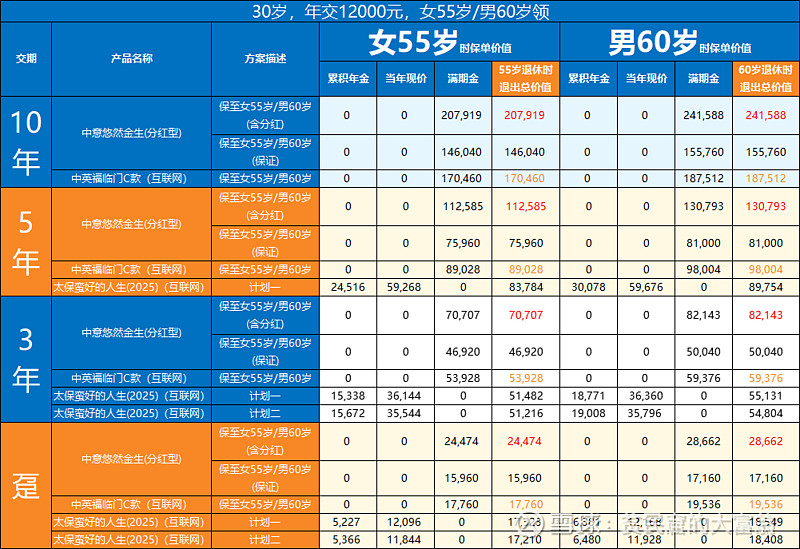 退休年龄我们就使用目前比较常规的:男60岁,女55岁。小编把目前的热门产品全部拉进来了,给大家一图对比清楚: