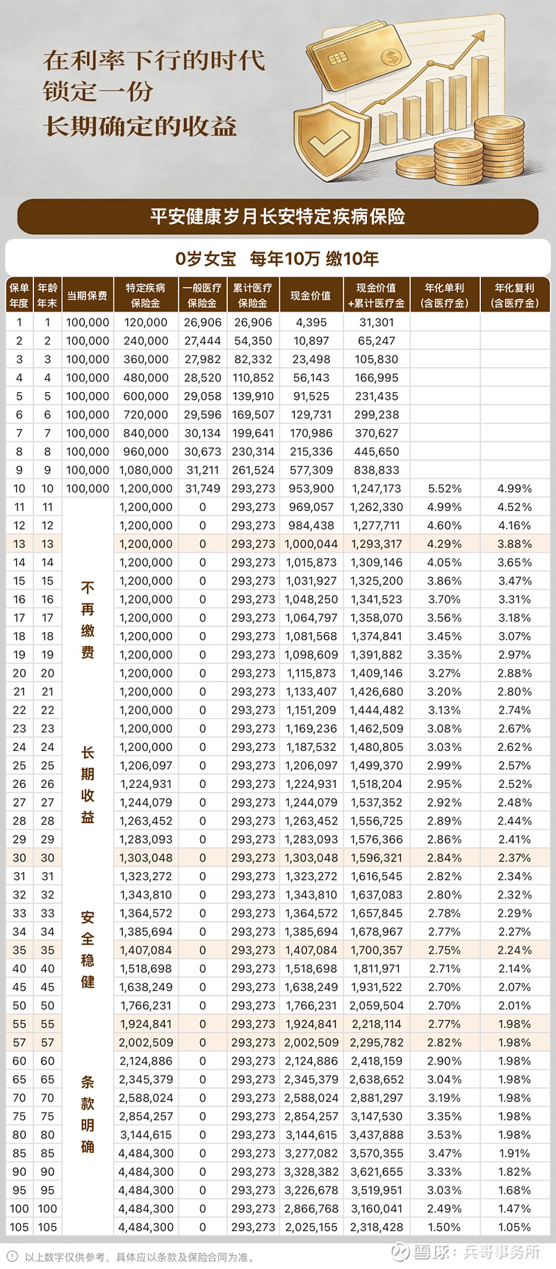 0岁女孩投保,10年总交10万保费,前10年每年医疗金2691-3175元,测算满10年退保IRR4.99%,这可是固定利率的产品哦,实打实的固定收益!