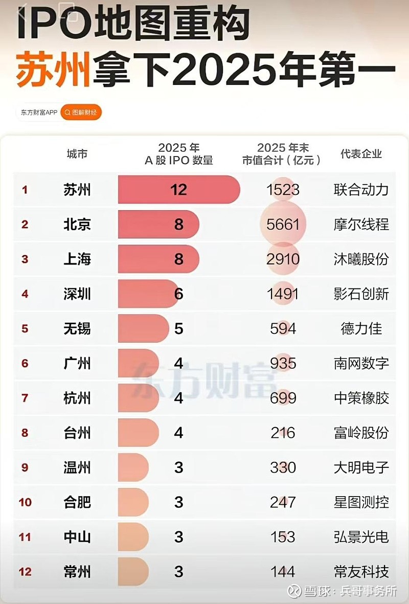 2025年苏州拿下12个IPO(占全国10.34%),无锡5个,常州3个,形成中国的制造业重镇,但是苏州的12个IPO知名度远低于北京、上海和杭州,北京上海市以高科技企业为主,杭州的企业品牌价值更强,容易被公众认知。