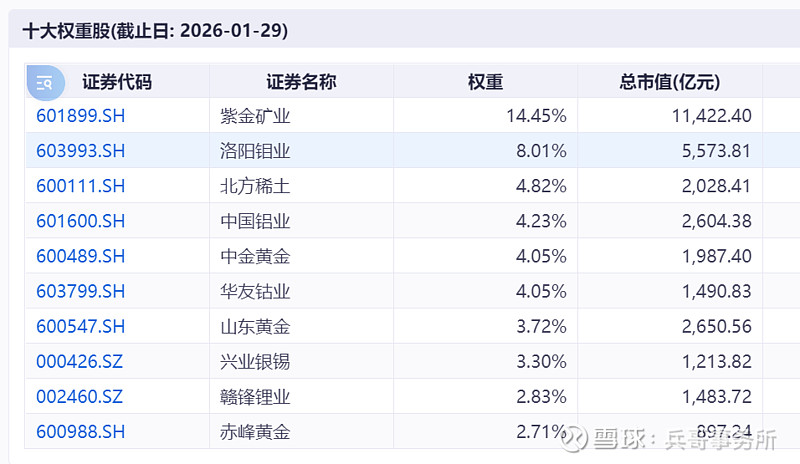 有色金属 ETF基金(516650)持仓相对均衡,它跟踪的是中证细分有色金属产业主题指数,持仓高度集中于产业链头部企业。截至2026年1月29日,其前十大重仓股权重合计超过50%,其中紫金矿业单一持仓占比高达14.45%,对龙头公司的业绩弹性暴露更为充分。这种结构使其在行业景气上行期,可能获得比宽基有色ETF更高的弹性收益。