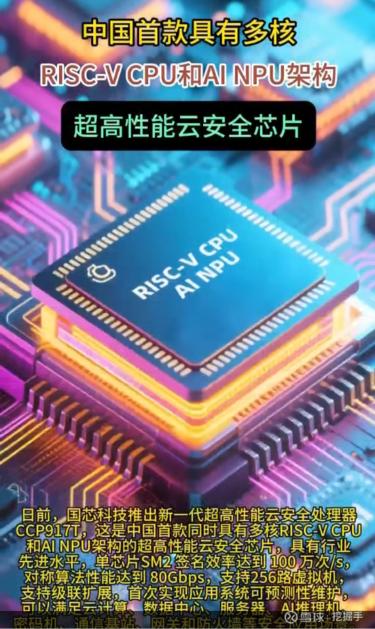 算力数据中心除了需要GPU,CPU 等卡,也需要云安全计算芯片,保驾护航。 中国首款具有多核RISC-V CPU和AI NPU架构的超高性能云安全芯片。用于云计算、数据中心、服务器、AI推理机、密码机、通信基站、网关和防火墙等安全应用场景。
