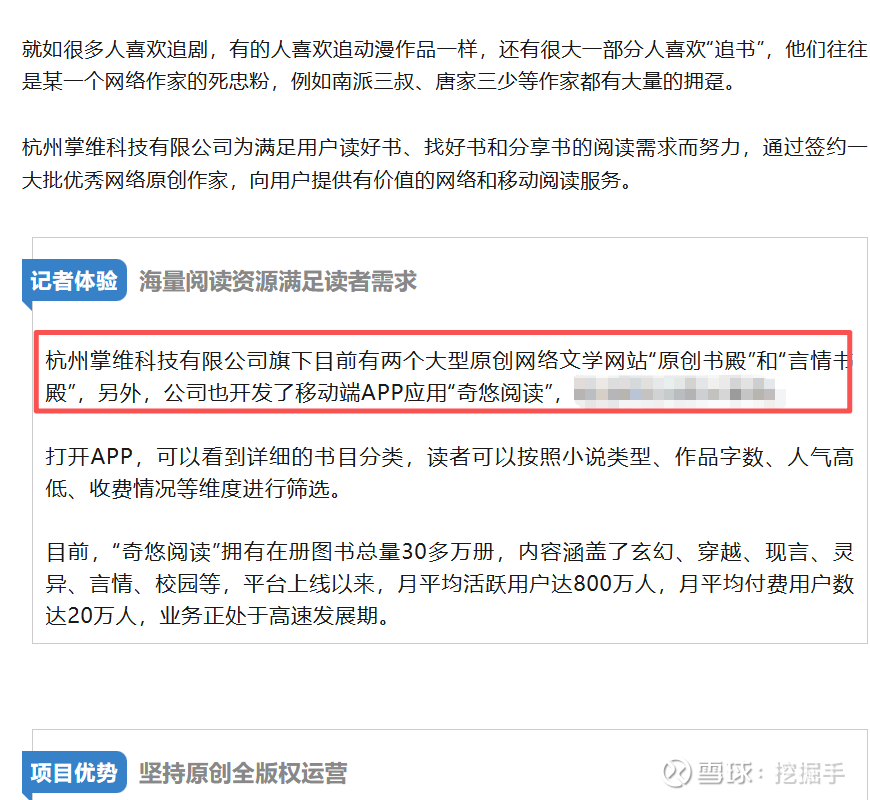 目前,"奇悠阅读“拥有在册图书总量30多万册,内容涵盖了玄幻、穿越、现言、灵异、言情、校园等,平台上线以来,月平均活跃用户达800万人,月平均付费用户数达20万人,业务正处于高速发展期
