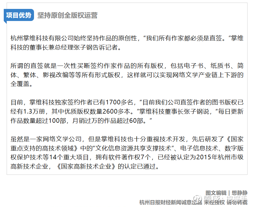 一:思美子公司掌维科技持有和签约的多个IP,旗下目前有两个大型原创网络文学网站”原创书殿“和"言情书殿”,另外,公司也开发了移动端APP应用“奇悠阅读”,