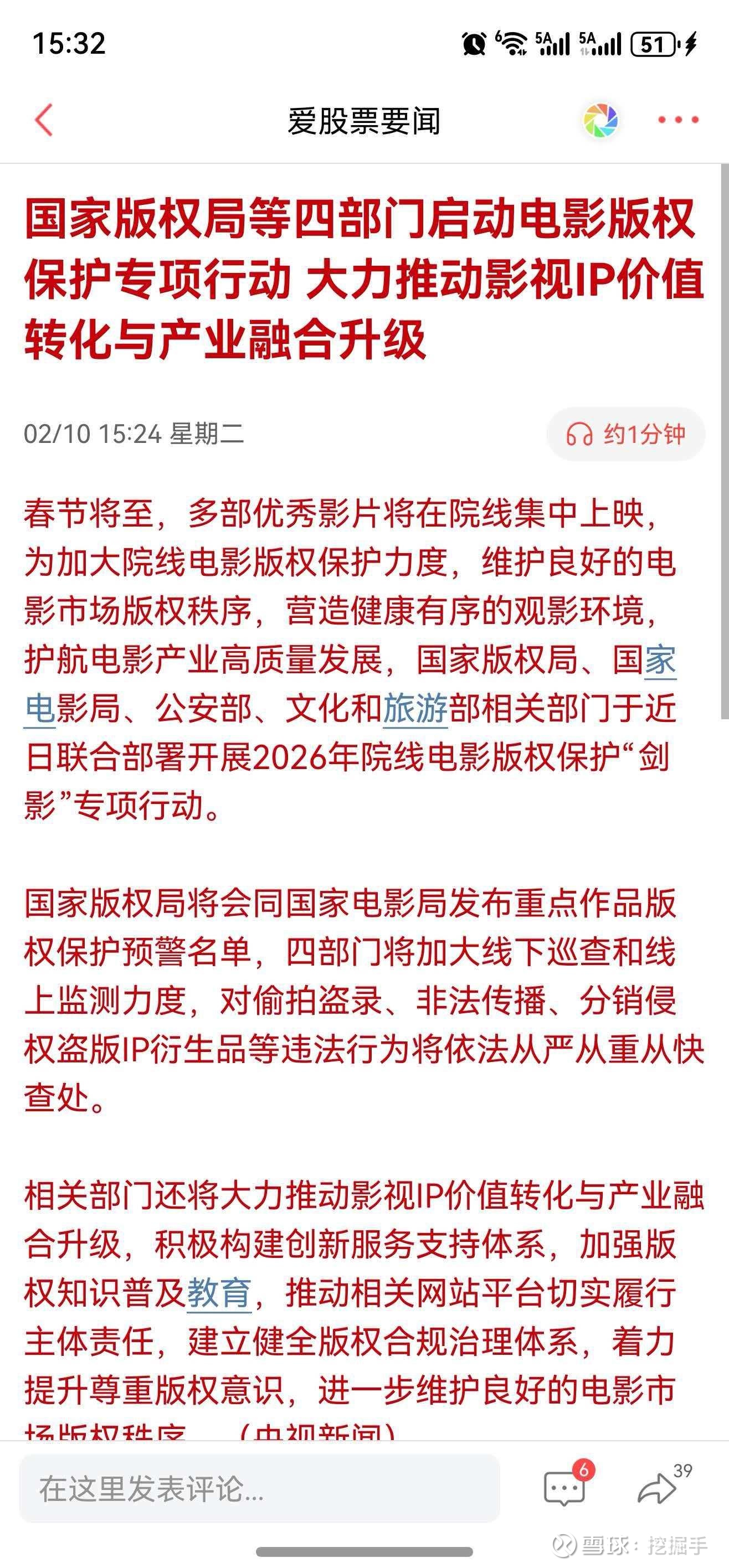 盘后资讯:国家版权局等四部门启动电影版权保护专项行动大力推动影视IP价值转化与产业融合升级。