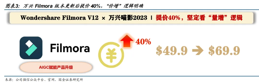 业绩会说话!23Q1 公司视频创意产品同比增长超 45%,23H1 公司视频创意产品同比增长超 41%,考虑到视频创意产品线主要产品 Filmora 大版本更新后提价幅度为 40%,可知提价并未影响付费用户热情,AI 赋能公司业务“量价齐升”逻辑得到验证。