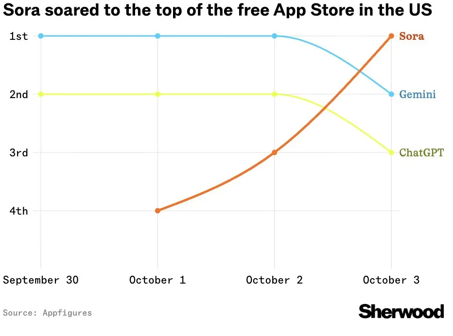 10月3日,即上线第四天,该应用拿下了苹果美国应用商店 App Store 的免费应用榜第一名(且仍处邀请制、仅限美加iOS),超越了 OpenAI 的 ChatGPT 和谷歌的 Gemini,具备病毒传播的大火潜质。
