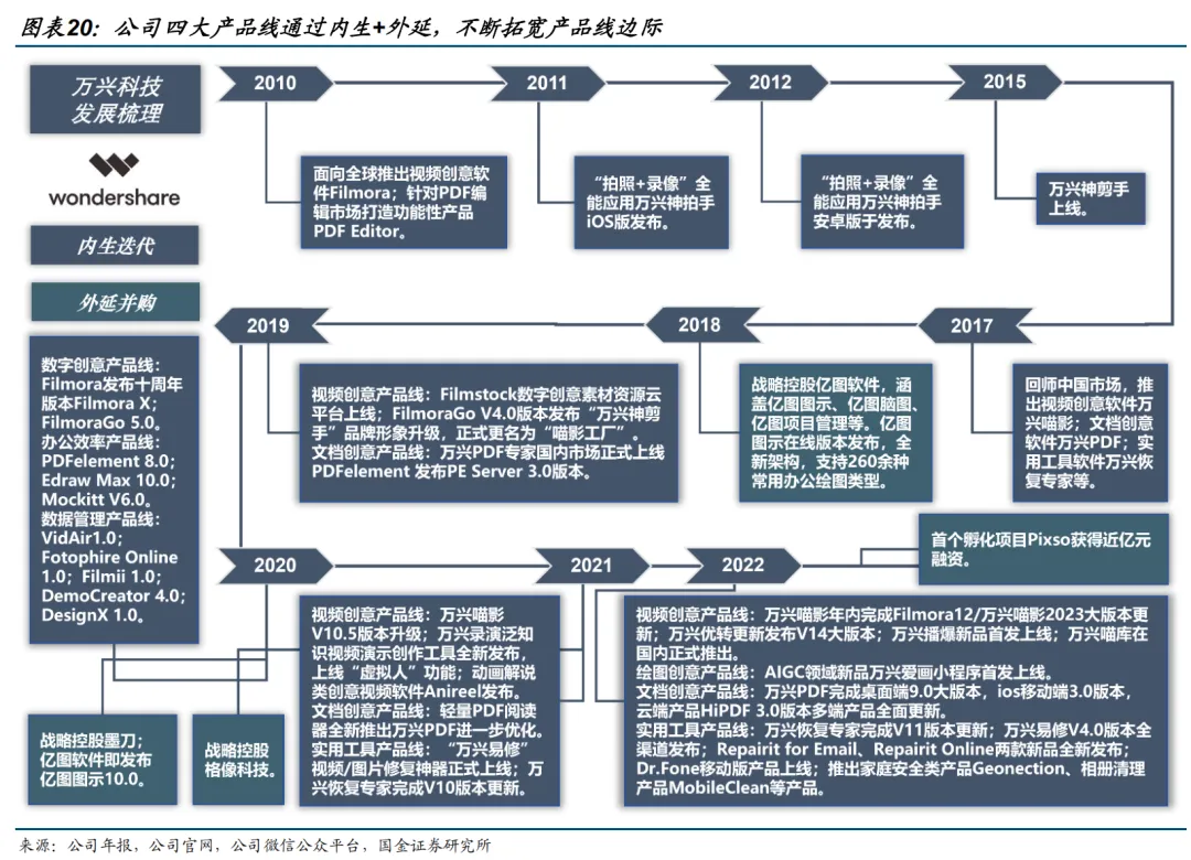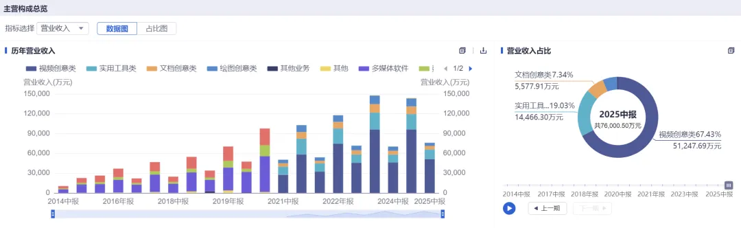 成立于2003年,核心业务是做视频剪辑工具的,目前形成了视频创意、绘图创意、文档创意、实用工具四大业务。