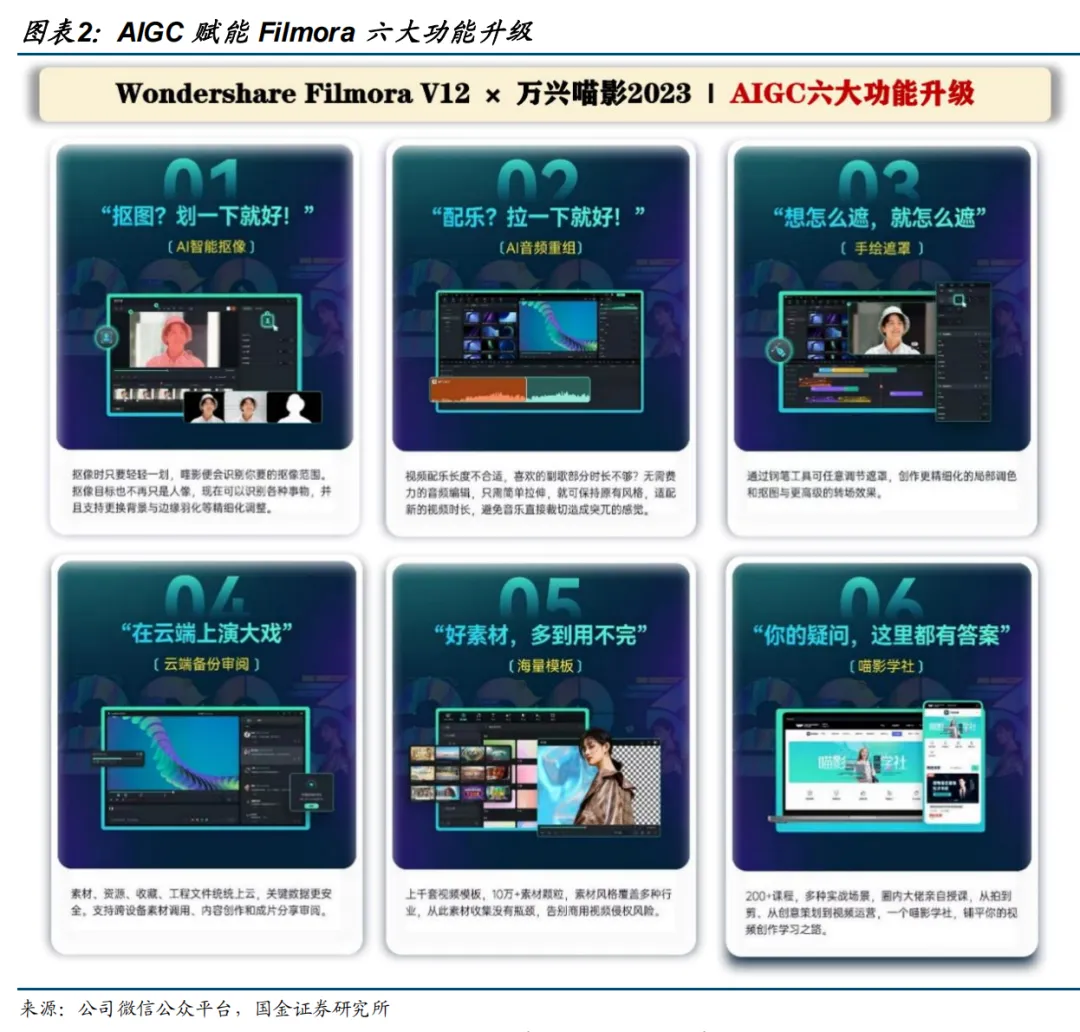 万兴于 2022 年 12 月中旬对旗下视频创意核心产品 Filmora 进行大版本更新,发布 Wondershare Filmora V12×万兴喵影2023。集成六大AIGC功能升级,切中用户需求痛点。