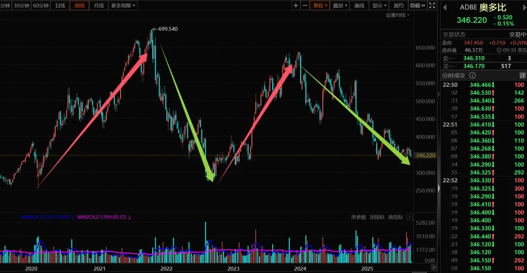 因为一方面我相信随着这个话题的大热,节后市场不会缺少资金对万兴的炒作,毕竟有23年的资金记忆;另一方面看着海外Adobe的一路回调走势,我想AI时代是否意味着某些工具的护城河突然不见了,这些工具的价值大受冲击?