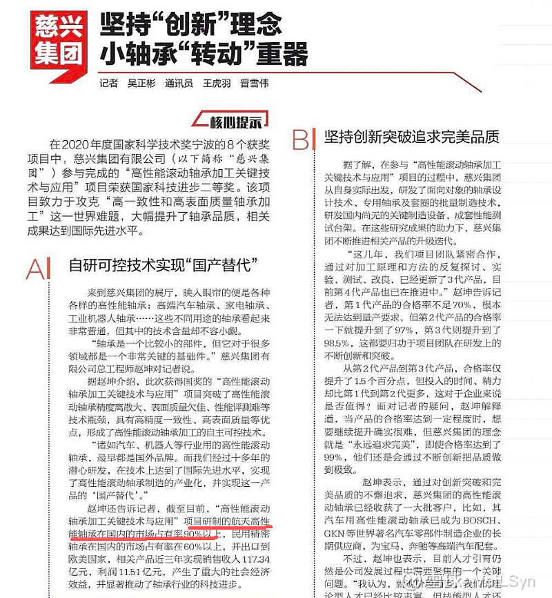 说到商业航天,巧的是21年慈兴总工采访时曾提到,“航天高性能轴承国内市占率90%”,虽说是5年前的数据,但我相信现在也不会太差,最起码不是没有吧?