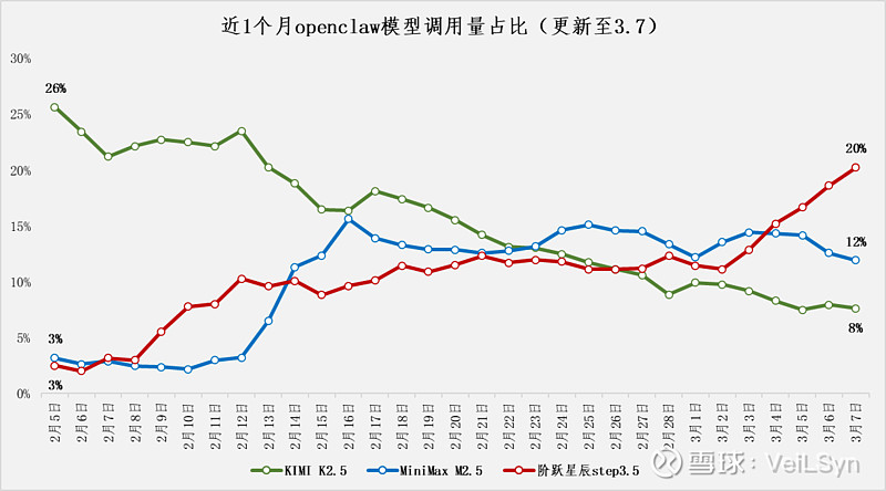 1.云赛智联:逻辑很简单,一张小龙虾近1个月模型调用量的变化图就足够了。阶跃星辰的step3.5超过KIMI和MiniMax,已经连续多日霸榜。很多人上周四五看到阶跃星辰调用量第一的新闻,可能以为是昙花一现,但看完这张图,你就知道这个含金量有多少。阶跃星辰最佳映射就是云赛智联(中贝通信好像也可以,没太研究过)。