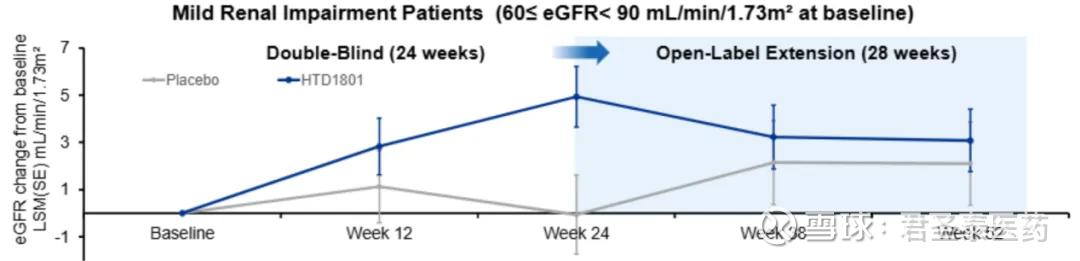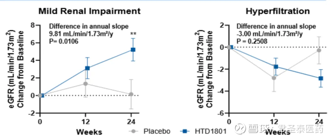 轻度肾损伤患者[eGFR基线60~90 ml/(min·1.73m²)]: 与安慰剂组相比,HTD1801治疗组患者的eGFR自基线实现了显著提升[5.30 vs. 0.35 ml/(min·1.73m²)]。更令人振奋的是,HTD1801组呈现出正向的eGFR斜率,与安慰剂组相比,年化eGFR斜率的差异高达9.81 ml/(min·1.73m²)/年 。这表明患者的肾功能衰退趋势不仅被延缓,甚至出现了逆转的迹象。