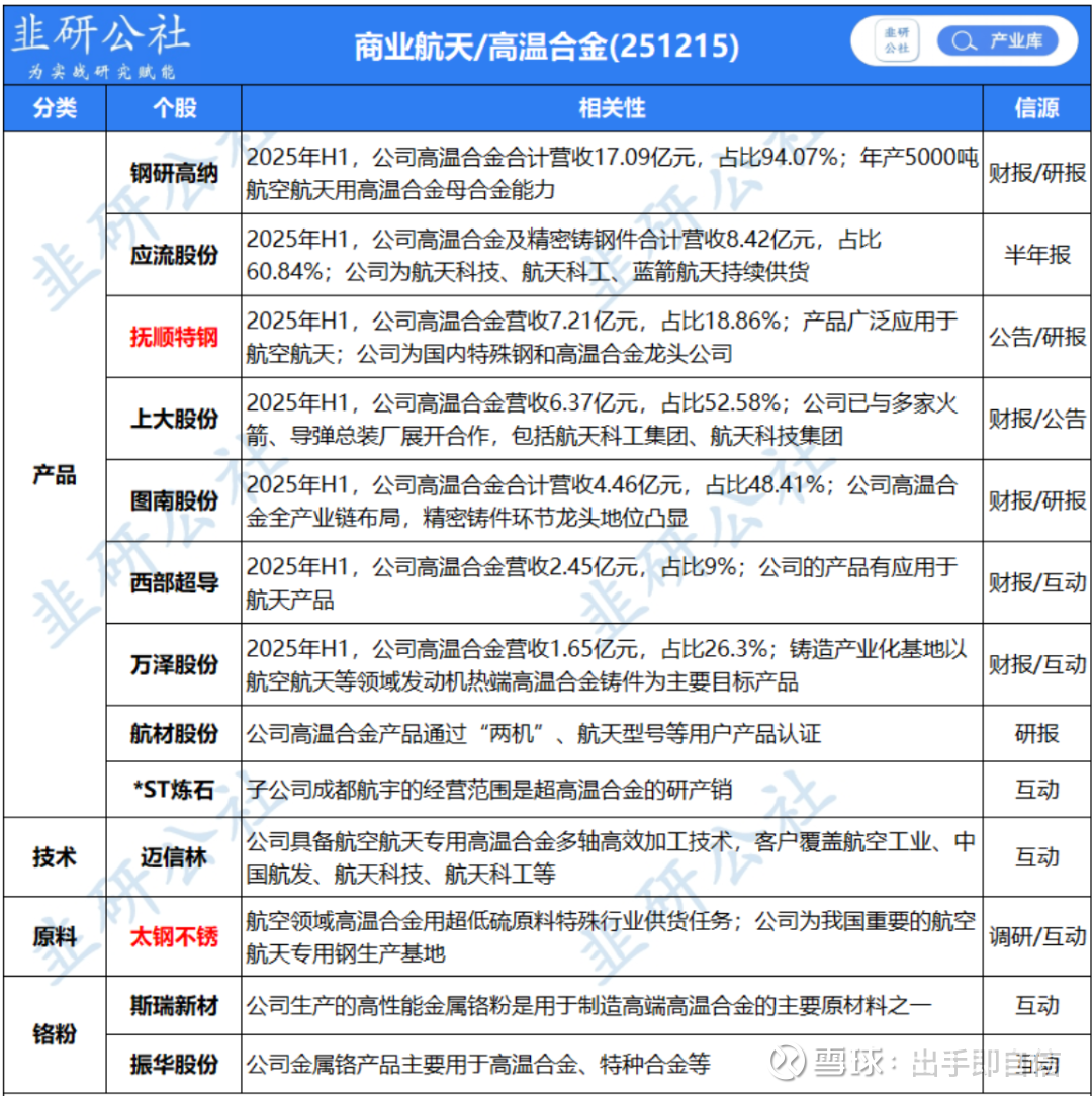 1、据机构研报,航空航天是高温合金最大的下游应用领域,占比约55%;高温合金是火箭发动机核心部件燃烧室和涡轮泵的关键用材,高温合金量占比在25%左右。