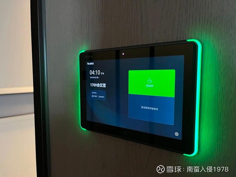 电子门牌实时显示:每个会议室门口安装的亿联网络电子门牌,实时同步飞书日程,清晰展示会议室预定状态、会议主题和时间。