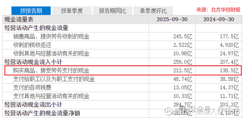 其实,这两者是同一件事的两面——主动备货。2025年前三季度,公司为购买商品和接受劳务支付的现金高达212.5亿元,同比猛增53.43%,这正是现金流吃紧的主因。