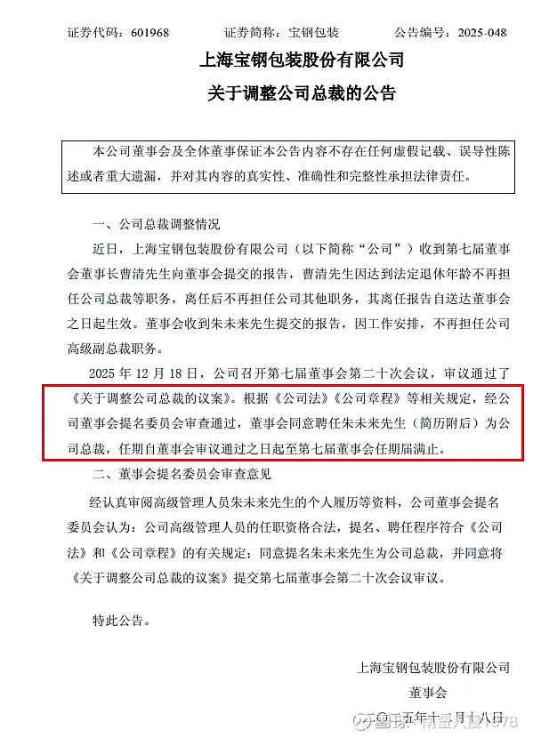 2025年12月19日 17:12 北京 宝钢包装12月18日发布公告,近日,公司收到第七届董事会董事长曹清先生向董事会提交的报告,曹清先生因达到法定退休年龄不再担任公司总裁等职务,离任后不再担任公司其他职务,其离任报告自送达董事会之日起生效。董事会收到朱未来先生提交的报告,因工作安排,不再担任公司高级副总裁职务。经公司董事会提名委员会审查通过,董事会同意聘任朱未来先生为公司总裁,任期自董事会审议通过之日起至第七届董事会任期届满止。朱未来先生:出生于1978年,中国国籍,大学本科。曾任上海宝钢产业发展有限公司项目部项目管理,河北宝钢制罐北方有限公司人事行政部负责人,上海宝钢产业发展有限公司办公室总经理秘书,宝钢金属有限公司团委书记,越南宝钢制罐有限公司总经理,上海宝钢包装股份有限公司总经理助理兼越南宝钢制罐(顺化)有限公司总经理、越南宝钢制罐有限公司总经理;公司高级副总裁兼越南宝钢制罐有限公司董事长、马来西亚宝钢制罐有限公司董事长、柬埔寨宝钢制罐有限公司董事等职务。朱未来先生现任公司董事、党委副书记、完美包装工业有限公司执行董事。