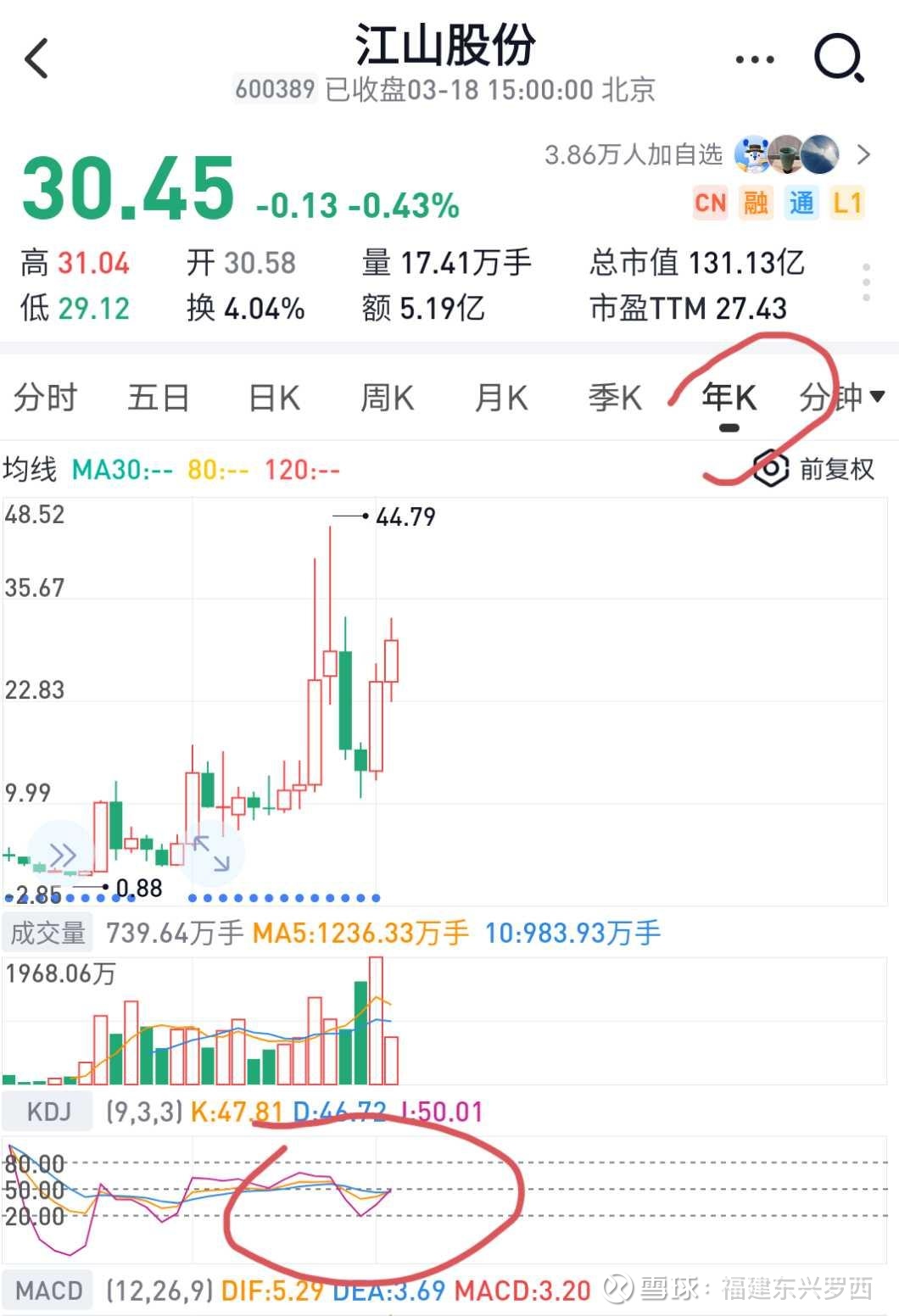 2、年K线,kdj已经开始金叉,从长期趋势上来说这个很难改变,短期的波动不可能改变中长期趋势。而且江山股份已经两根年阳线了,而且第二根年阳线是涨幅80%的大阳柱。