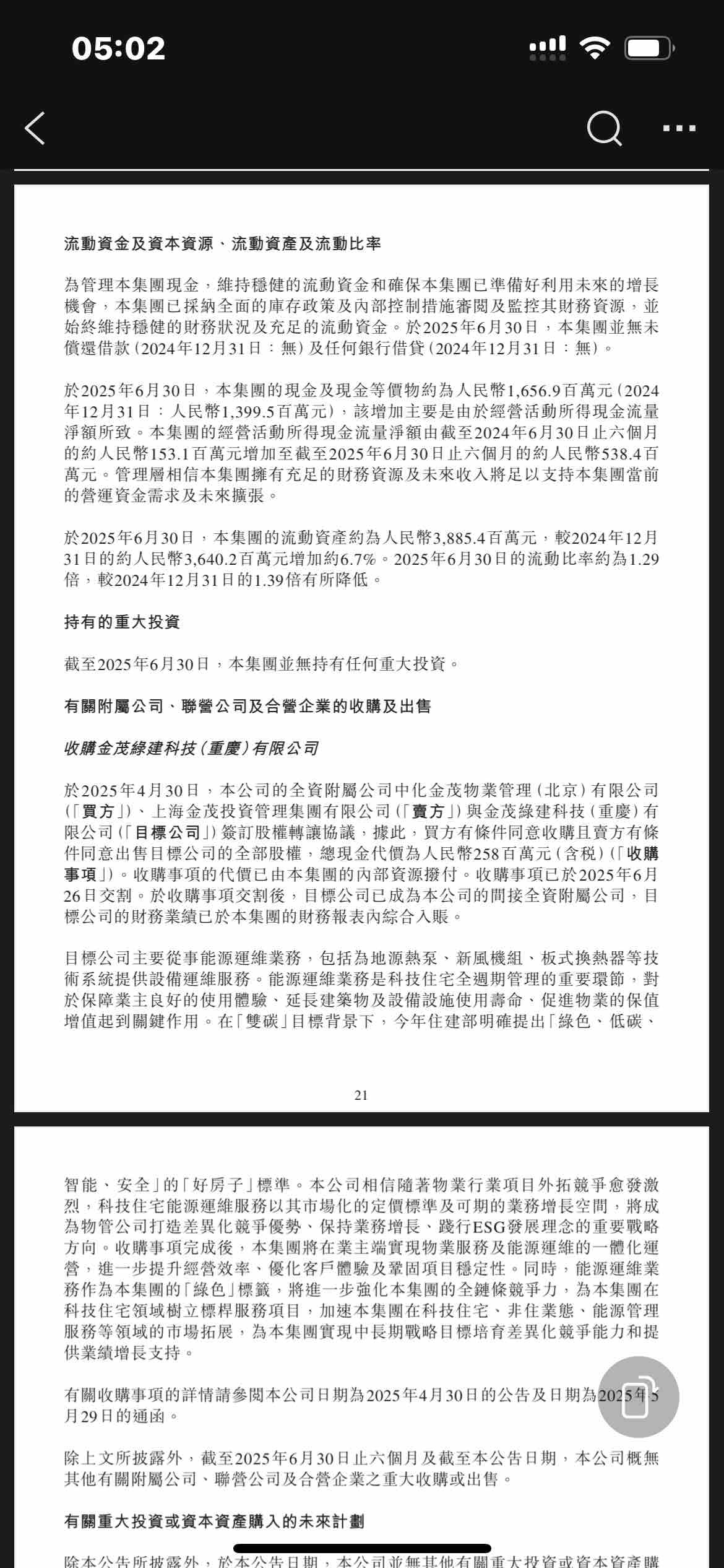 $金茂服务(00816)$ 经营现金流量净额由去年上半年1.5亿增长到今年上半年5.3亿,造成在手现金由14亿增加到16.5亿人民币,无任何有息负债,属于净现金公司,业绩增长低于销售和毛利增长是加大了计提的原因,看现金流更真实。公司市值25亿人民币,减去在手16.5亿现金,业务估值仅七八亿人民币,而每年净利润四五亿,极度低估状态。今年上半年新增业务协约额3.8亿,未来增长发展动力很足,尤其是金茂地产销售同比已经增长,所以近年大幅下滑影响业绩的高毛利非业主增值服务将由负增长变正增长,从而为业绩增长做出贡献。本次中期每股合计0.15元的分红超预期,个人觉得两年内随着地产行业企稳,股价到15元目标不变。一家集轻资产,安全,低估,高息,适度增长,永续行业于一身的好股